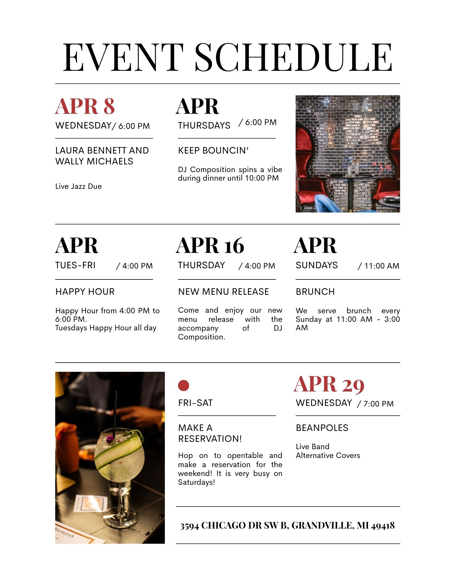 - Chef-inspired menu: elevated dinner and brunch menu to give you a taste unlike West Michigan as seen before by Executive Head Chef John Seekford